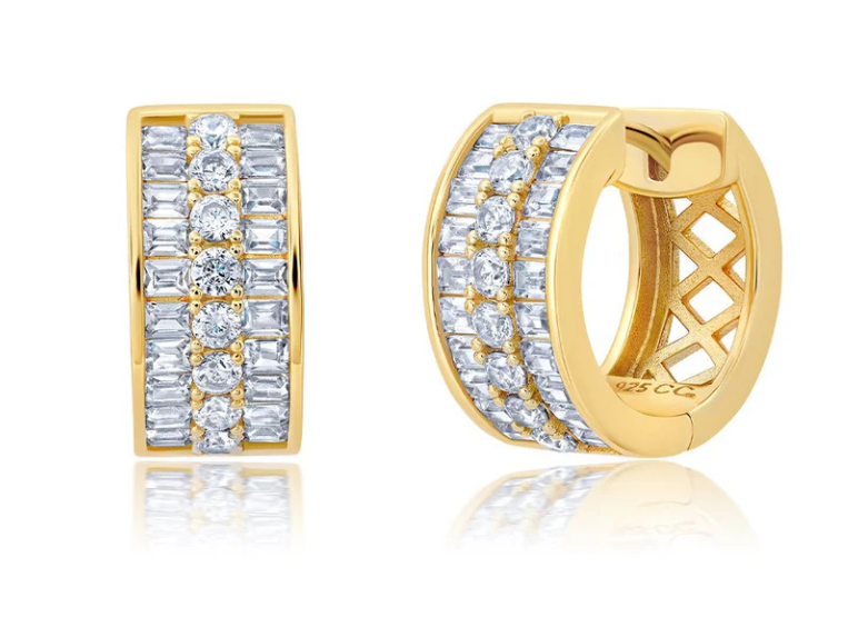 Sterling Silver Small 3 Row CZ Baguette & Round Huggie Earrings Finished in 18KT Yellow...