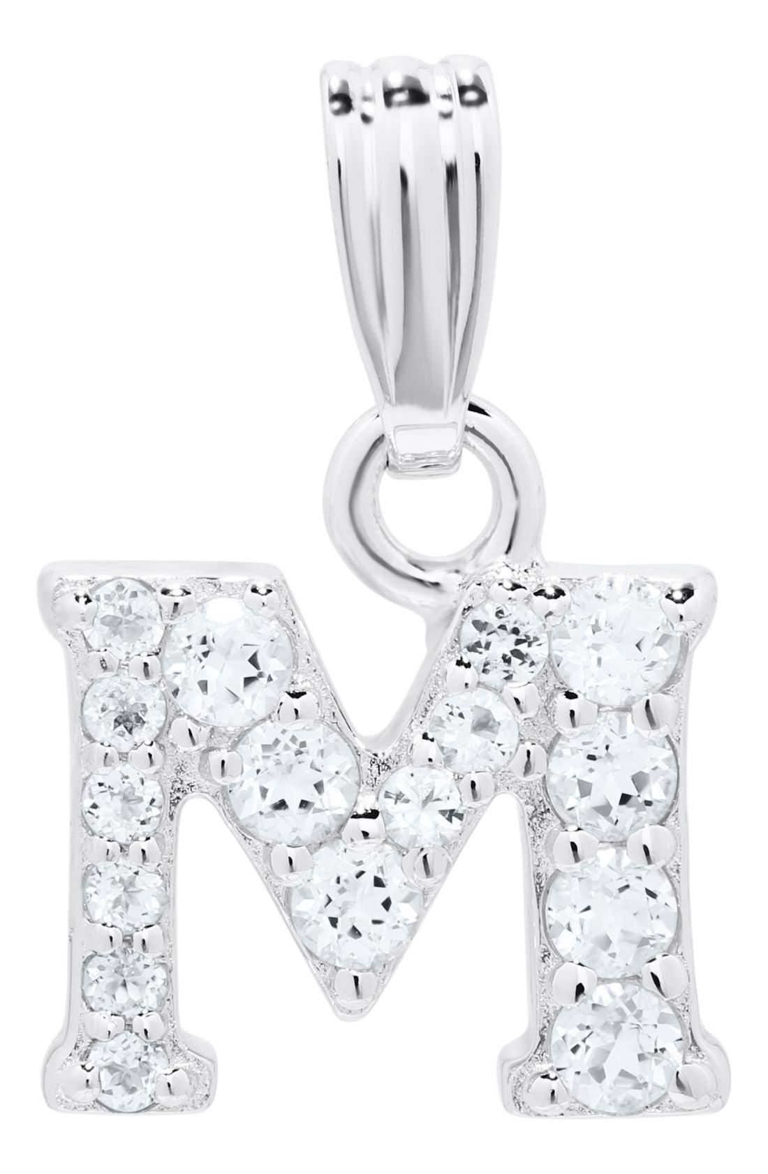 Sterling Silver Rhodium Plated White Topaz Initial "M" Pendant with 15" Cable Chain
