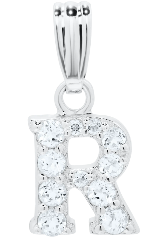 Sterling Silver Rhodium Plated White Topaz Initial "R" Pendant with 15" Cable Chain