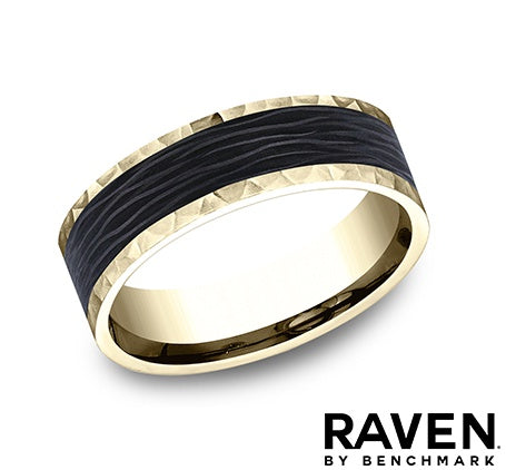 14KT Yellow Gold 7mm Comfort Fit Wedding Band with Black Forged Carbon Fiber & Hammered...