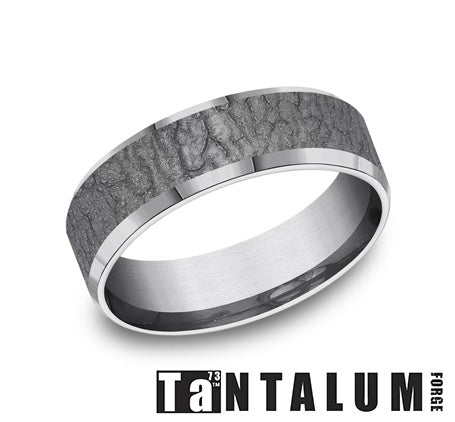 7mm Comfort Fit Grey Tantalum Band with Tree Bark Patterned Center & Polished Drop Beveled...