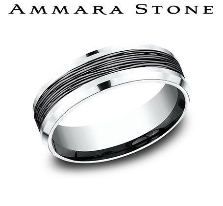 14KT White Gold & Grey Tantalum 7mm Comfort Fit Wedding Band with Horizontal Bark Pattern...
