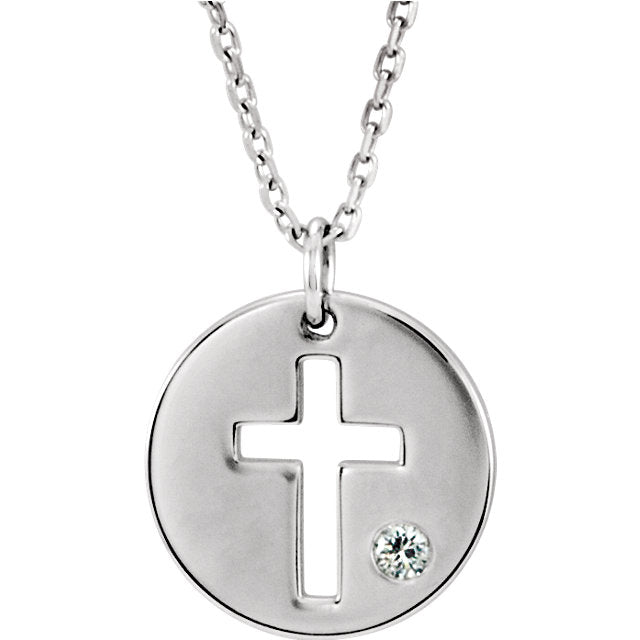 14KT White Gold 18" Diamond Pierced Cross Disc Necklace, Dia: 0.03ct t.w.