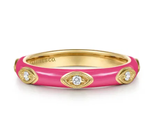 Gabriel & Co - Contemporary Collection - 14KT Yellow Gold Diamond Split Stackable Ring with Fuchsia Enamel, Dia: 0.08ct t.w., Size 6.5, Serial No: S2052943