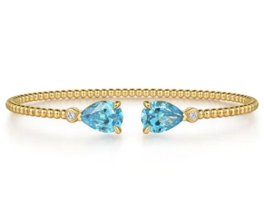 Gabriel & Co - Bujukan Collection - 14KT Yellow Gold 5.75" Diamond & Pear Shape Swiss Blue Topaz Bujukan Bangle, Dia: 0.07ct., SBT: 5.09ct t.w., Serial No: S2183228