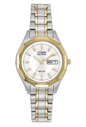 CITIZEN - CORSO - Ladies Two-Tone Stainless Steel Eco-Drive Watch with White Dial, Luminous Hour and Minute Hands, Day-Date Indicator, Fold Over Clasp with Push Button, Mineral Crystal, WR100/10Bar/333ft Swimming, Showering & Snorkeling.