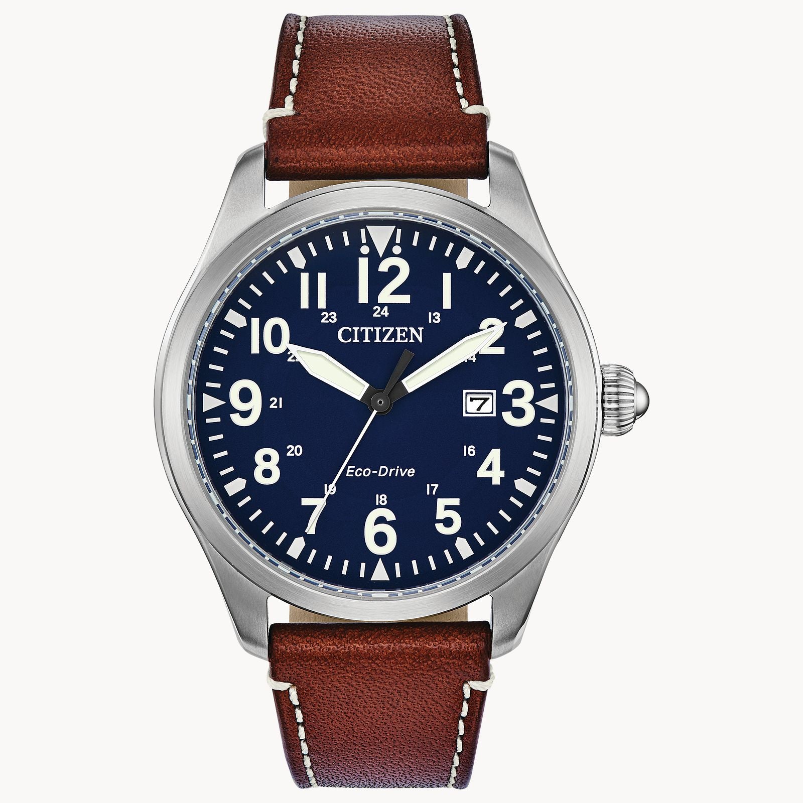 CITIZEN - GARRISON - Men's Stainless Steel Eco-Drive Watch with Navy Blue Dial, Date Display, Camel Colored Strap, WR100/10Bar/333ft [Swimming, Showering & Snorkeling]