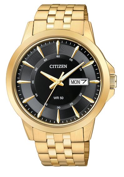 CITIZEN - QUARTZ - Men's Gold-Tone Stainless Steel Quartz Watch with Black Dial, Window Day-Date Display, Luminous Gold-Tone Hour & Minute Hands & Water Resistant