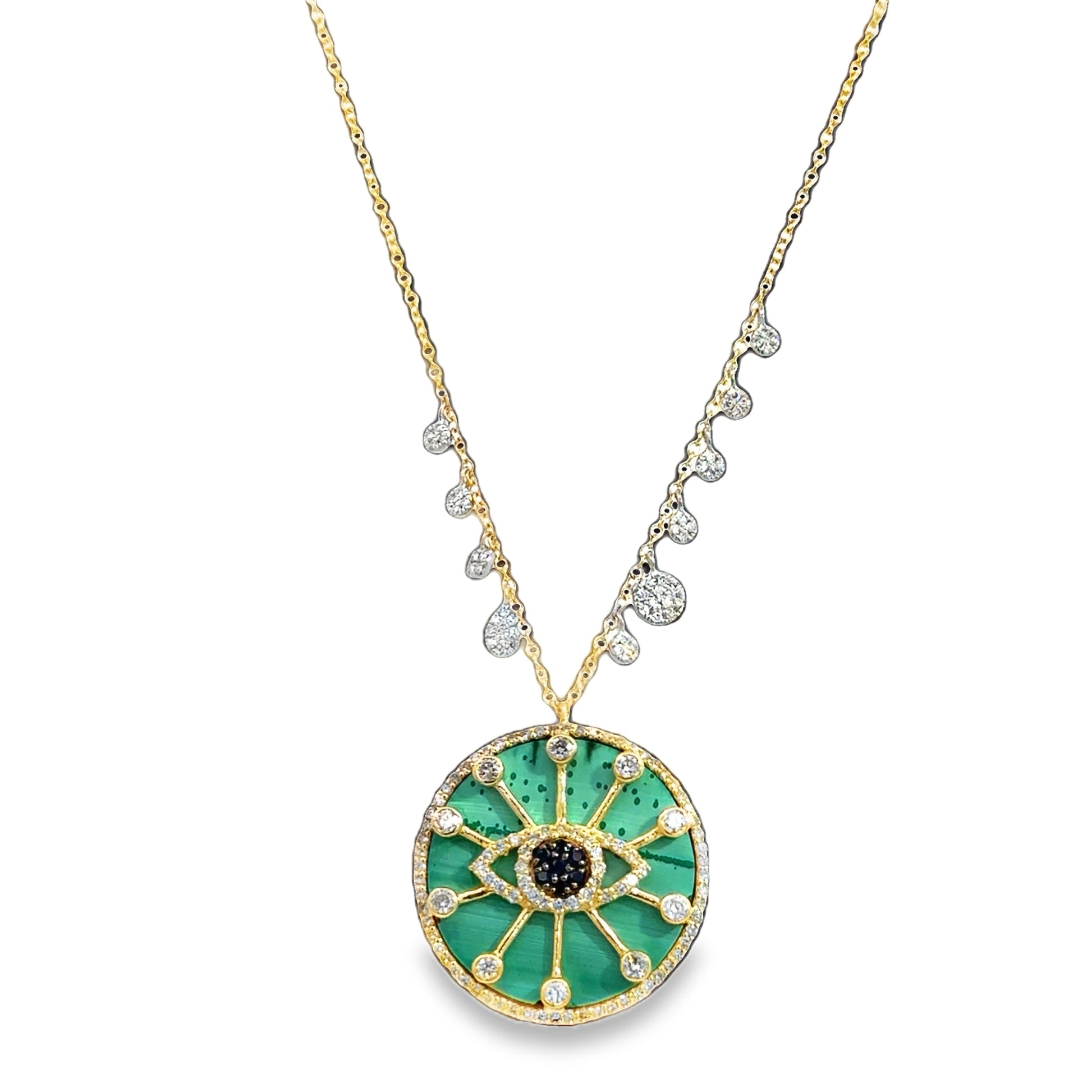 MeiraT - 14KT Two-Tone 18"-17"-16" Malachite, Sapphire & Diamond Evil Eye Necklace with Off Centered-Charms, Col: 10.87ct., Dia: 0.89ct t.w.