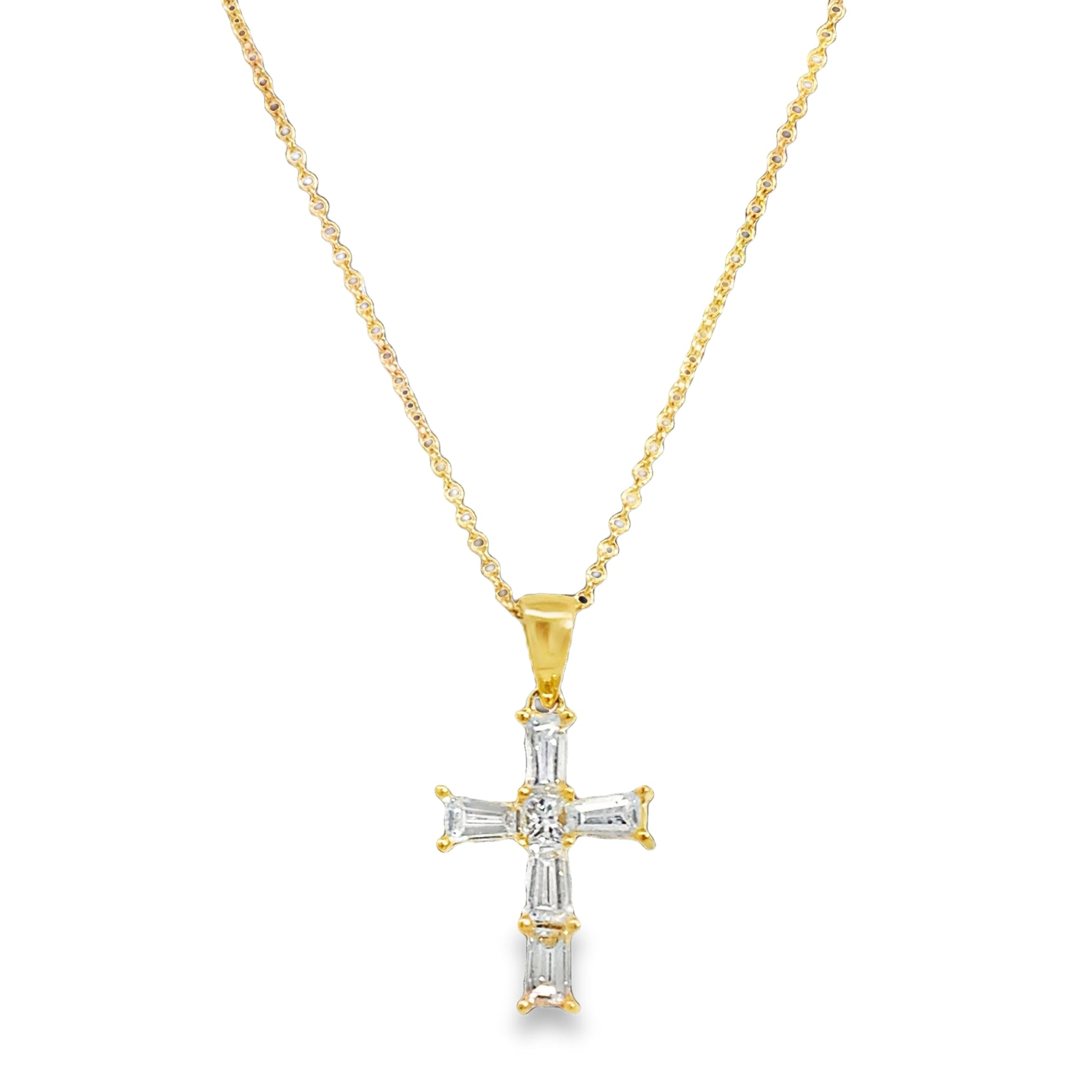 18KT Yellow Gold Baguette & Round Diamond Cross Pendant with 16" Cable Chain, Dia: 0.90ct t.w.