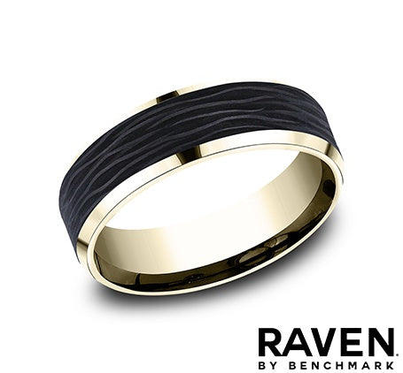 14KT Yellow Gold 7mm Comfort Fit Wedding Band with Black Forged Carbon Fiber Center & Bevel Edges, Size 10