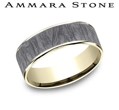 14KT Yellow Gold & Grey Tantalum 7.5mm Comfort Fit Wedding Band with Fabric Patterned Center & Polished Thin Edges, Size 10