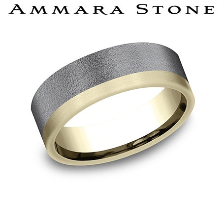 14KT Yellow Gold & Darkened Tantalum 7mm Comfort Fit Wedding Band with Wire Brush Finish & One Satin Edge, Size 10