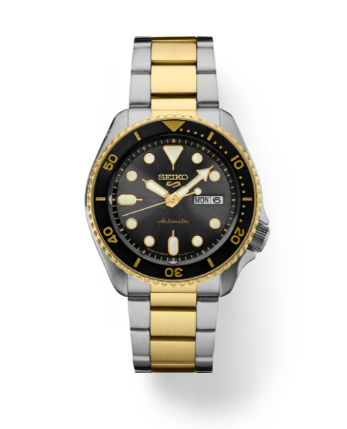 SEIKO - 5 SPORTS - Men's Two-Tone Stainless Steel Automatic Watch With Manual Winding Capability, Sunray Finish Charcoal Gray Dial, Day/Date Calendar, Luminous Hands & Markers, Screwdown See-Through Caseback, Black Uni-Directional Rotating Elapsed Timing Bezel & 10 Bar, 100M Water Resistant