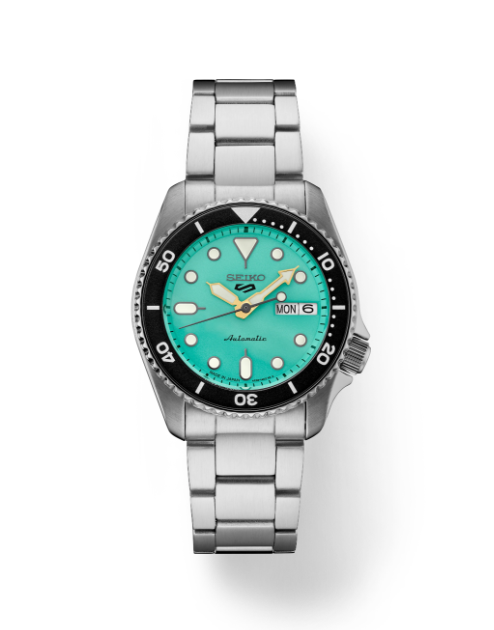 SEIKO - 5 SPORTS - Ladies Stainless Steel Automatic Watch with VIbrant Green Dial, Day/Date Calendar, Luminous Hands & Markers, Black Uni-Directional Rotating Bezel, Screwdown See-Through Caseback, Approx 41 Hours Power Reserve & 10 Bar, 100M Water Resistant