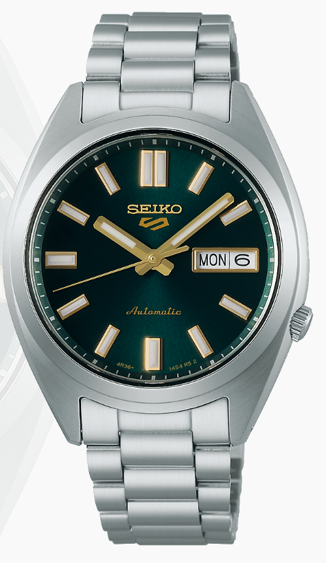 SEIKO - 5 Sports - Men's Stainless Steel Automatic Watch with Manual Winding Capability, Deep Green Sunray Finish Dial with Gold Accents, Day/Date Calendar, LumiBrite Hands & Markers, Curved Hardlex Crystal & Water Resistant to 10 Bar, 100 Meters (330 Feet)
