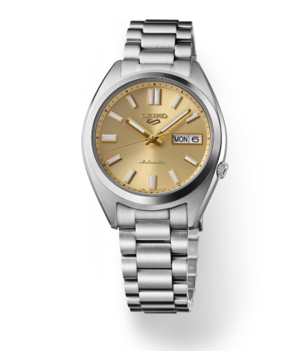 SEIKO - 5 SPORTS - Men's Stainless Steel Automatic Watch with Manual Winding Capability, Golden Sunray Finisg Dial with Gold Accents, Diamond Cut Indices with Gold Finish, Day/Date Calendar, LumiBrite Hands & Markers, Curved Hardlex Crystal & 10 Bar, 100 Meters (330 Feet)