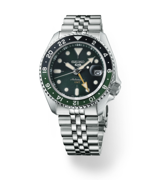 SEIKO - 5 SPORTS - Men's Stainless Steel Automatic Watch with Manual Winding Capability, Dark Green Dial, Large Gold GMT Hand, Magnified Date Calendar, Luminous Hands & Marker, Screwdown See-Through Caseback, Dramatic Green & Black Bi-Color 24-Hour GMT Bezel, Hardlex Crystal, Power Reserve: Approximately 41 Hours & Water Resistant to 10 Bar, 100 Meters (330 Feet)