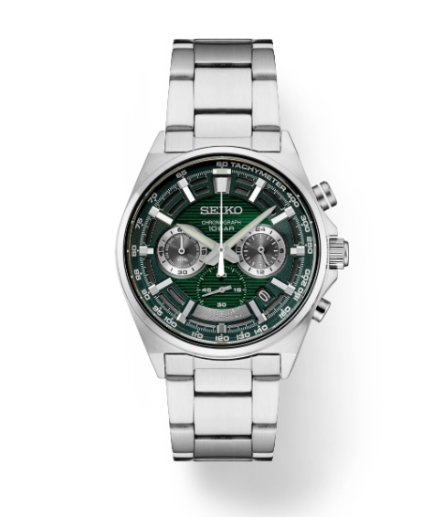 SEIKO - ESSENTIALS - Men's Stainless Steel Chronograph Watch with Dimensional Embossed Green Dial with Applied Metallic Elements & Black & Gray Accents, Black Tachymeter Ring, 24-Hour Subdial, Date Indicator, 24-Hour Subdial, 10 Bar, 100M Water Resistant