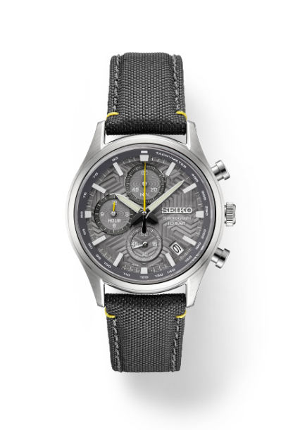 SEIKO - ESSENTIALS - Men's Chronograph Watch with Matte Gray Dial with Y-Shaped Pressed Pattern, Date Calendar, LumiBrite Hands & Markers, Sapphire Crystal, Rugged Nylon/Leather Strap with Vivid Yellow Accent Stitching & 10 Bar, 100M Water Resistant