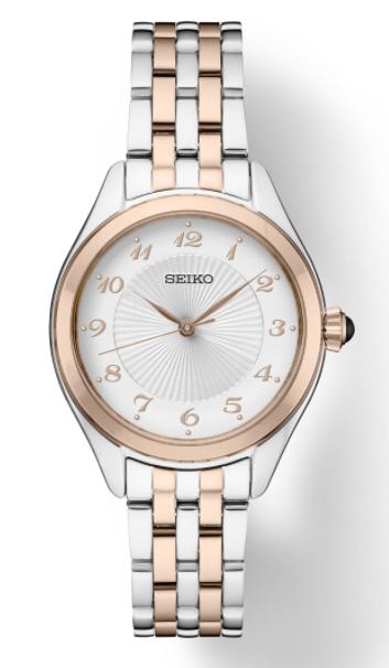 SEIKO - ESSENTIALS - Two-Tone Rose Gold Finish Stainless Steel Quartz Watch with Patterned White Dial with Stylized Arabic Numerals, Cabochon Crown, Water-Resistant to 5 Bar, 50 Meters (165 Feet)