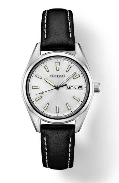 SEIKO - ESSENTIALS - Ladies Stainless Steel Quartz Watch with Silver-White Sunray Dial, LumiBrite Hands & Markers, Day/Date Calendar, Sapphire Crystal, Black Leather Strap with Contrast Stitching & Water-Resistant to 10 Bar, 100 Meters (330 Feet)