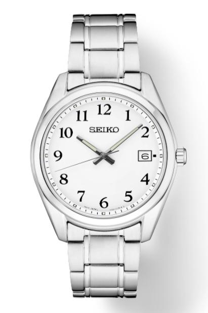SEIKO - ESSENTIALS - Men's Stainless Steel Quartz Watch with White Dial with Arabic Numerals, LumiBrite Hands, Date Calendar, Sapphire Crystal & Water-Resistant to 10 Bar, 100 Meters (330 Feet)