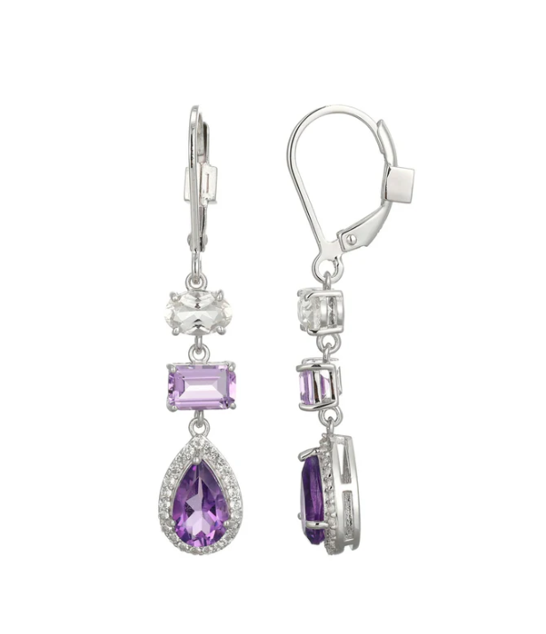 ELLE - Sway Collection - Sterling Silver Rhodium Plated Africa Amethyst, White Topaz & Pink Amethyst Leverback Earrings