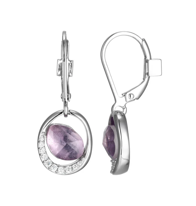 ELLE - Treasure Collection - Sterling Silver Rhodium Plated Doublet Genuine Amethyst & CZ Leverback Drop Earrings