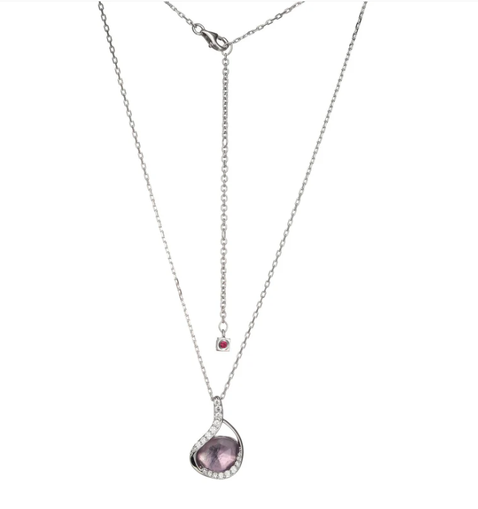 ELLE - Treasure Collection - Sterling Silver Rhodium Plated Doublet Genuine Amethyst & CZ Pendant on A 17"+3" Faceted Diamond-Cut Cable Chain