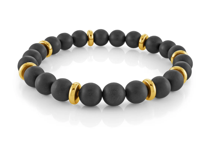8.25" 8mm Stainless Steel Gold-IP-Plated & Black Matte Onyx Stretch Beaded Bracelet