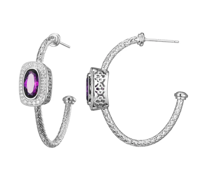 Charles Garnier - Classic Mesh 2 Collection - Sterling Silver Rhodium Plated Genuine Amethyst & CZ Hoop Earrings